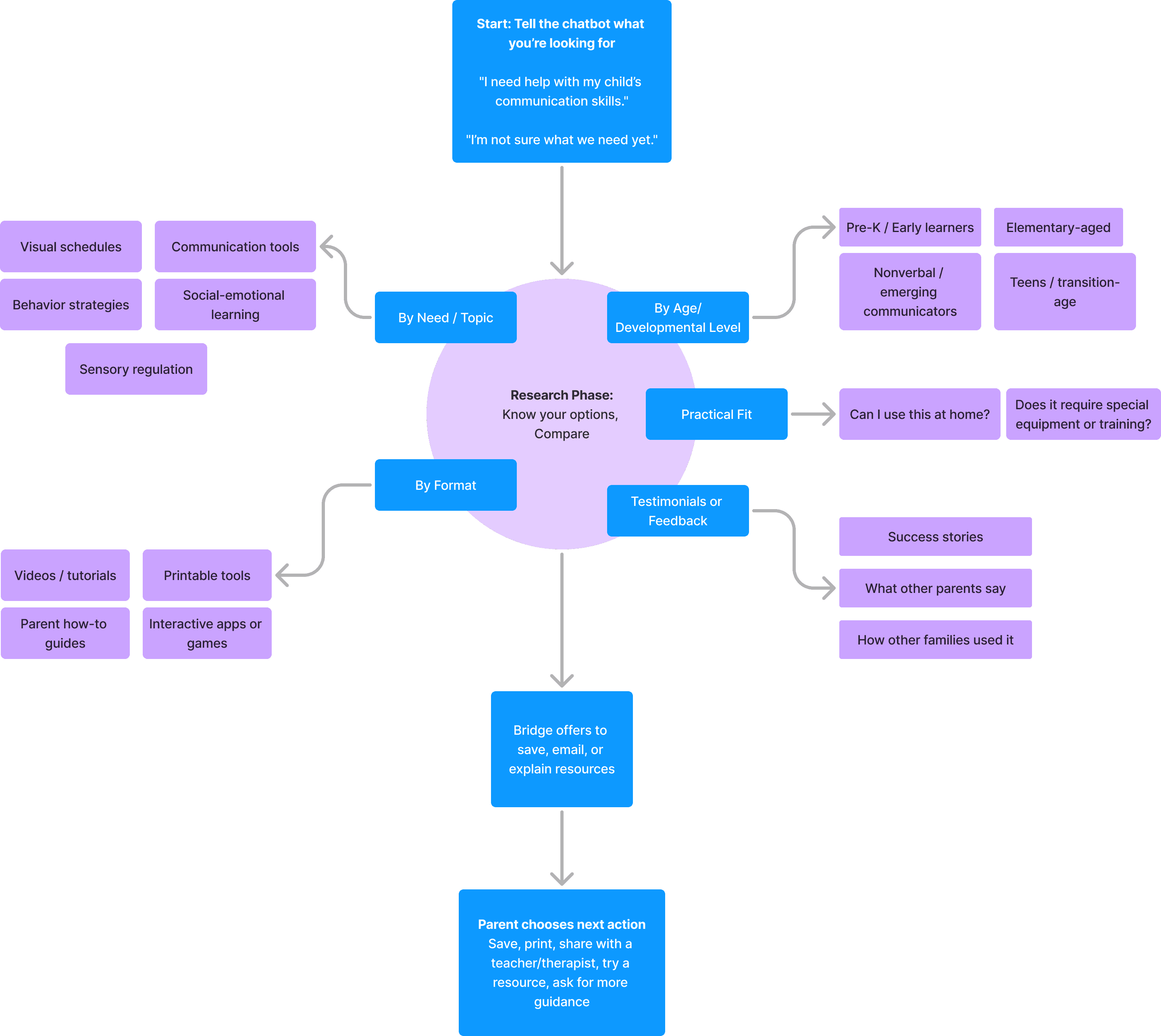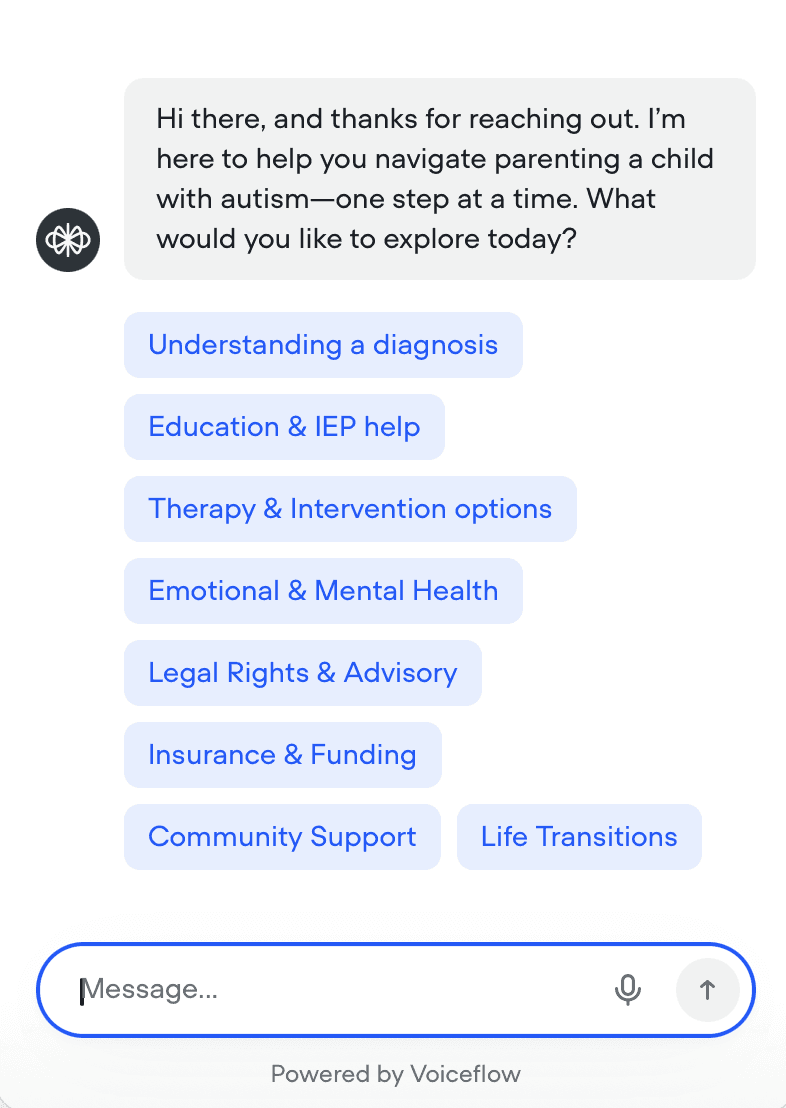 A working prototype built in Voiceflow that feels more like texting a helpful friend. Focused on empathy, built with NLU, and designed to meet parents where they are.